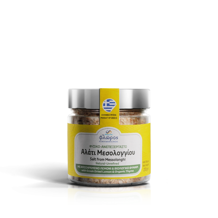 Συστατικά: Φυσικό ανεπεξέργαστο αλάτι Μεσολογγίου με αποξηραμένο φυσικό λεμόνι και βιολογικό θυμάρι