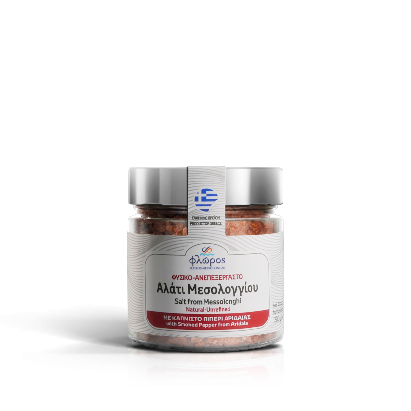Συστατικά: Φυσικό ανεπεξέργαστο αλάτι Μεσολογγίου με καπνιστό πιπέρι Αριδαίας
