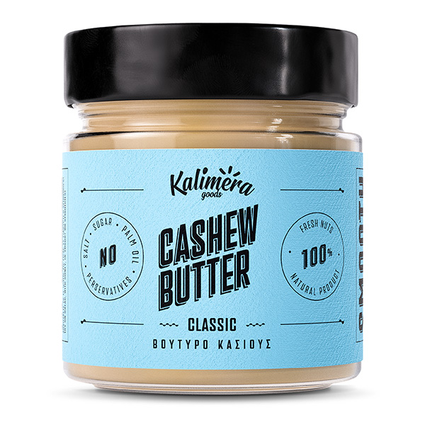 ΒΟΥΤΥΡΟ ΚΑΣΙΟΥΣ KALIMERA GOODS. Το βούτυρο κάσιους προέρχεται κυρίως από τον θρυμματισμό κάσιους. Mέσω της επεξεργασίας αυτής απελευθερώνεται το λάδι του καρπού, και μας δίνει  μια πάστα με βουτυρένια υφή. Περιέχει μεγάλη ποσότητα μαγνησίου και ενός αμινοξέος, της L-τρυπτοφάνης, μιας ουσίας που μετατρέπεται σε σεροτονίνη στον εγκέφαλο, ενός σημαντικού νευροδιαβιβαστή που έχει να κάνει με το αίσθημα χαράς.